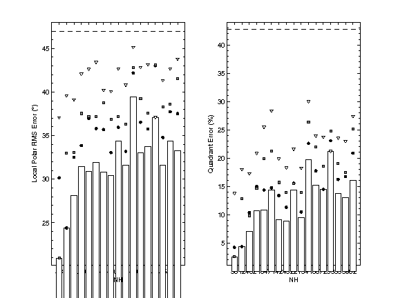 | 'fig15' | Reproduce Fig. 15: Bars: Localization performance of the pool listening to selected DTFs. Circles: DTFs from NH12. Squares: DTFs from NH58. Triangles: DTFs from NH33. |