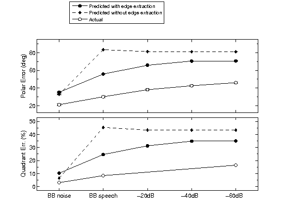 | 'fig13' | Reproduce Fig.13: Effect of high-frequency attenuation in speech. Actual experimental results are from Best et al. (2005). Open and filled symbols show actual and predicted results, respectively. Absolute polar angle errors (top) and QEs (bottom) averaged across listeners are shown. |