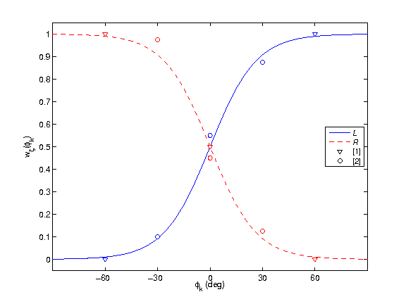 | 'fig2' | Reproduce Fig.2: Binaural weighting function best fitting results from Morimoto (2001) labeled as [1] and Macpherson and Sabin (2007) labeled as [2] in a squared error sense. |