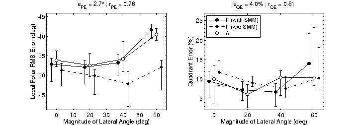 | 'fig6' | Reproduce Fig.6: Baseline performance as a function of the magnitudes of the lateral response angle. Symbols and whiskers show median values and inter-quartile ranges, respectively. Symbols were horizontally shifted to avoid overlaps. Correlation coefficients, \(r\) , and prediction residues, \(e\) , specify the correspondence between actual (A) and predicted (P) listener-specific performances. Predictions of the model without the sensory-motoric mapping (SMM) stage are shown with dashed lines. |
