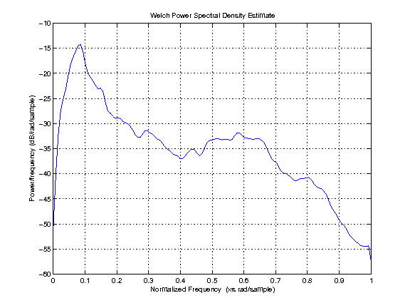 The following plot shows an estimate of the power spectral density of the first channels of the speech shaped noise: