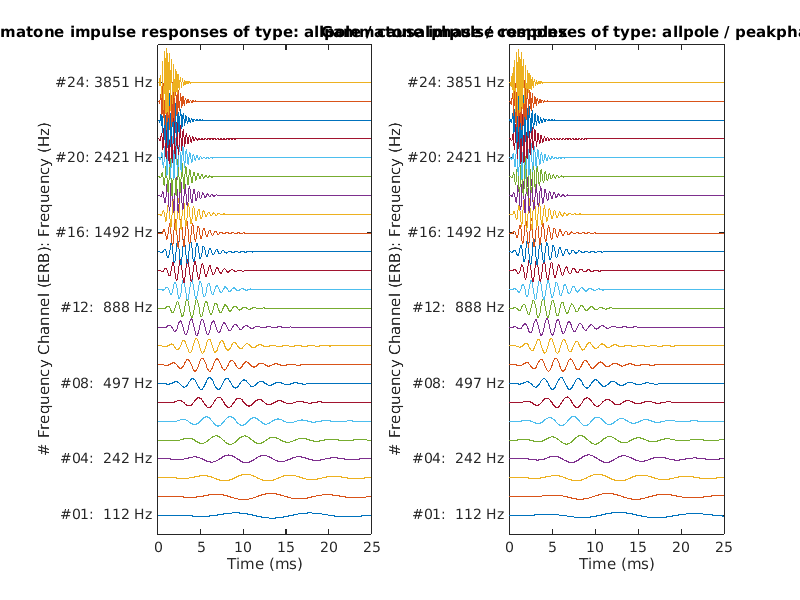 This figure shows IRs of Gammatone filters in 24 erb-spaced channels derived from gammatone with parameters allpole and complex (Hohmann, 2002). Left panel shows the causalphase option. Right panel shows the peakphase option, which aligns the IRs to the maxima of the corresponding envelope maxima.