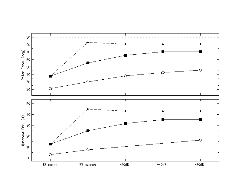 | 'fig11' | Reproduce Fig.11: Effect of high-frequency attenuation in speech localization. Actual experimental results are from Best et al. (2005). Absolute polar angle errors (top) and QE (bottom) were averaged across listeners. Circles and squares show actual and predicted results, respectively. Diamonds with dashed lines show predictions of the model without positive spectral gradient extraction. |