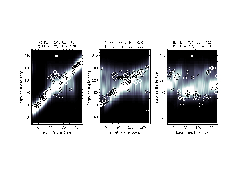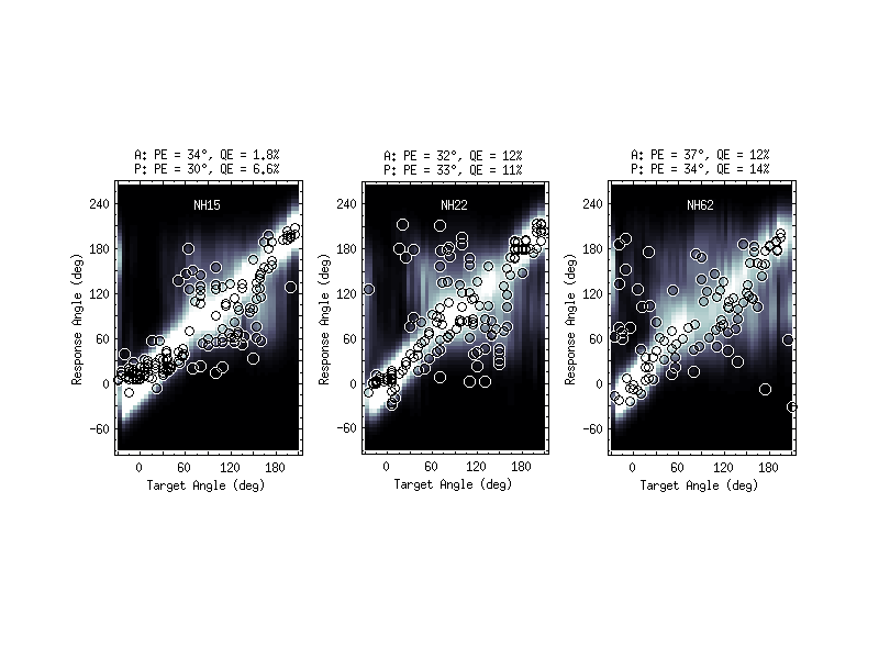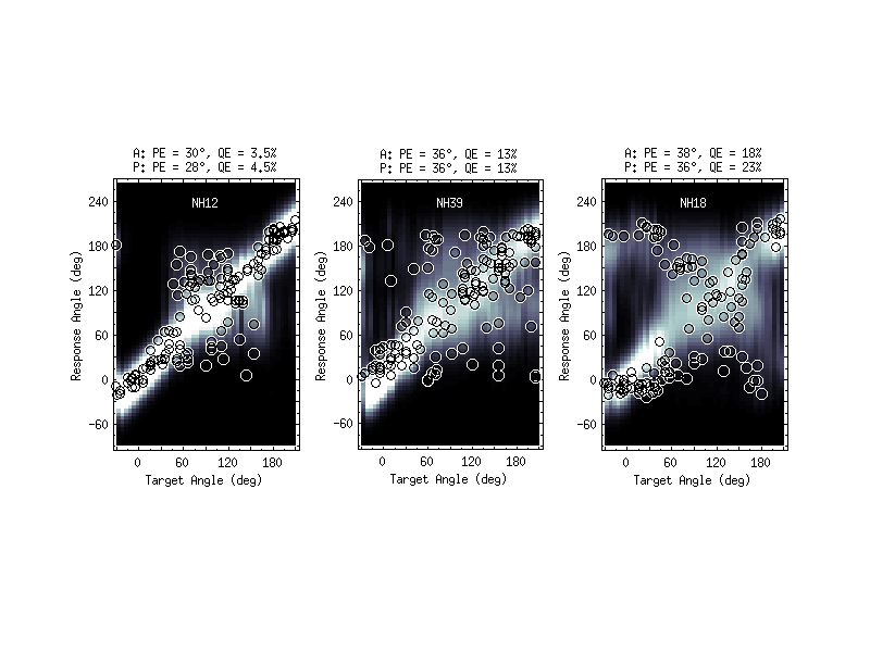 | 'fig3' | Reproduce Fig.3: Prediction examples. Actual responses and response predictions for three exemplary listeners when listening to median-plane targets in the baseline condition. Actual response angles are shown as open circles. Probabilistic response predictions are encoded by brightness according to the color bar to the right. Actual (A:) and predicted (P:) quadrant error rates (QE) and local polar RMS errors (PE) are listed above each panel. |