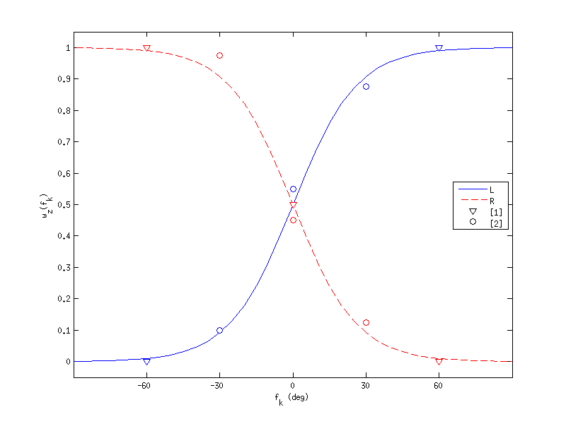| 'fig2' | Reproduce Fig.2: Binaural weighting function best fitting results from Morimoto (2001) labeled as \([1]\) and Macpherson and Sabin (2007) labeled as \([2]\) in a least squared error sense. |