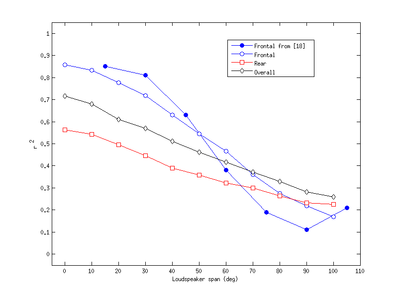 | Reproduce Fig.8 of Baumgartner and Majdak (2015): Effect of loudspeaker span in the median plane on coefficient of determination, r^2, for virtual source directions created by VBAP. Separate analysis for frontal, rear, and overall (frontal and rear) targets. Data pooled across listeners. Note the correspondence with the results obtained by Bremen et al. (2010). | |