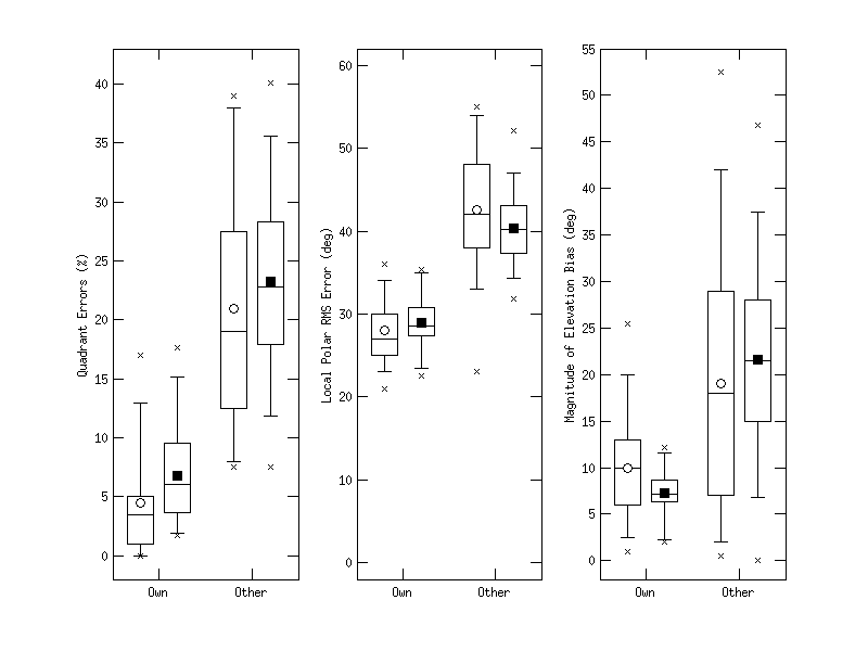 | 'fig9' | Reproduce Fig.9: Effect of non-individualized HRTFs in terms of untrained localization with others' instead of own ears. Statistics summaries with open symbols represent actual experimental results replotted from Fig.,13 of Middlebrooks (1999), statistics with filled symbols represent predicted results. Horizontal lines represent 25th, 50th, and 75th percentiles, the whiskers represent 5th and 95th percentiles, and crosses represent minima and maxima. Circles and squares denote mean values. |