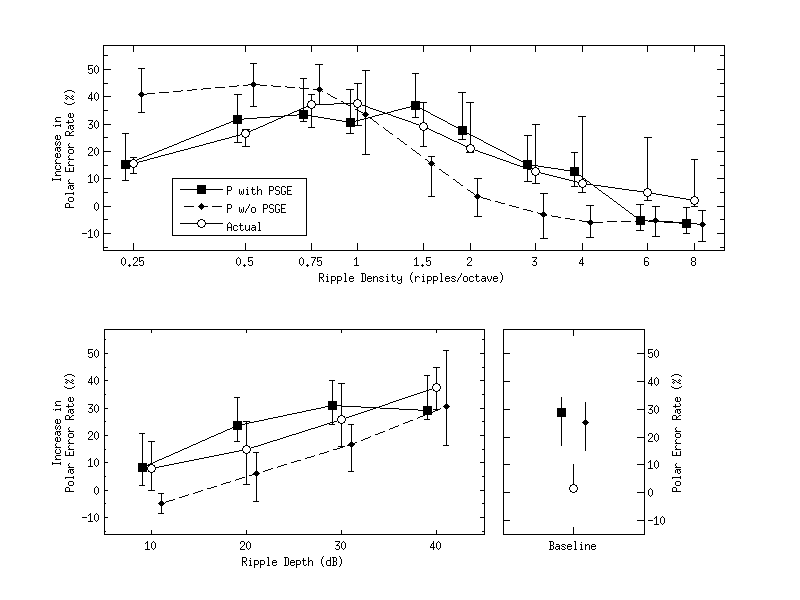 | 'fig10' | Reproduce Fig.10: Effect of spectral ripples. Actual experimental results (circles) are from Macpherson and Middlebrooks (2003). Predicted results (filled circles) were modeled for our listener pool (squares). Either the ripple depth of 40,dB (top) or the ripple density of one ripple/octave (bottom) was kept constant. Ordinates show the listener-specific difference in error rate between a test and the baseline condition. Baseline performances are shown in the bottom right panel. Symbols and whiskers show median values and inter-quartile ranges, respectively. Symbols were horizontally shifted to avoid overlaps. Diamonds with dashed lines show predictions (P) of the model without positive spectral gradient extraction (PSGE). |