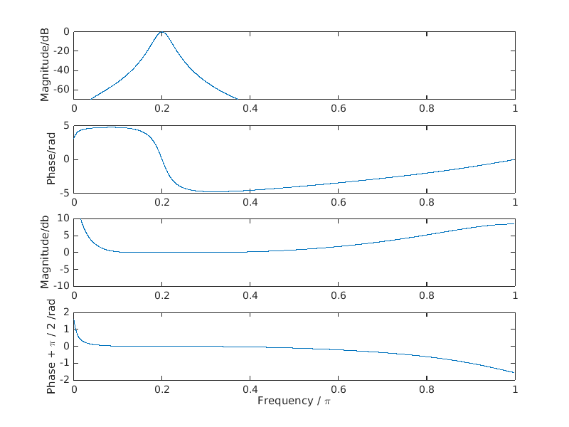 | 'fig2' | Reproduce Fig.2: Frequency response of the example Gammatone filter (upper two panels) and of the real-to-imaginary response(lower two panels). Pi/2 was added to the phase of the latter (see text). The frequency axis goes up to half the sampling rate (z=pi). |