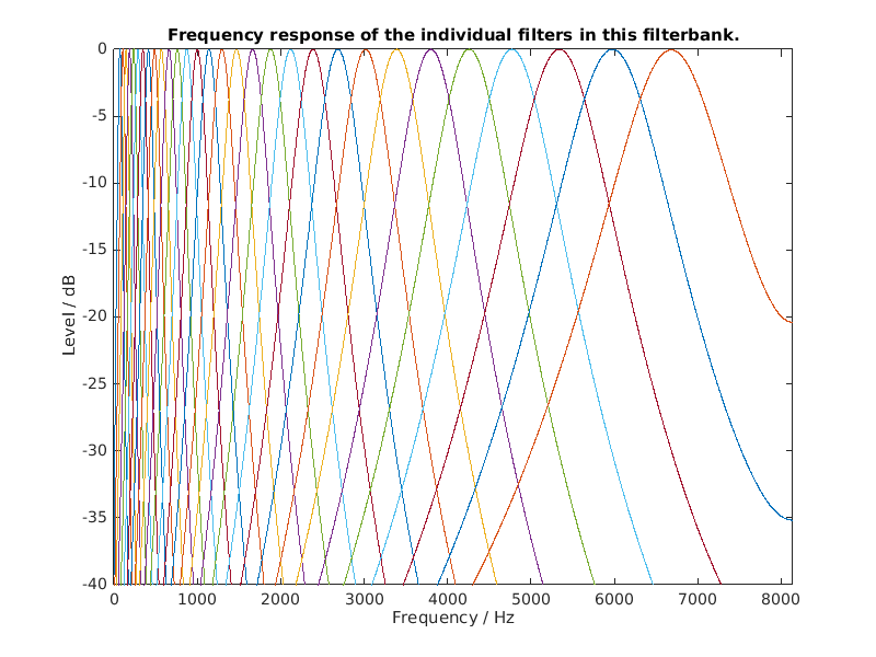 | 'fig3' | Reproduce Fig.3: Magnitude frequency response of the Gammatone filterbank. In this example, the filter channel density is 1 on the ERB scale and the filter bandwidth is 1 ERBaud. The sampling frequency was 16276Hz and the lower and upper boundary for the center frequencies were 70Hz and 6.7kHz, respectively. |
