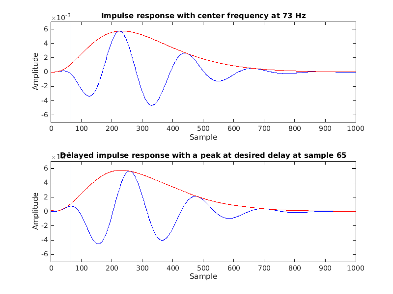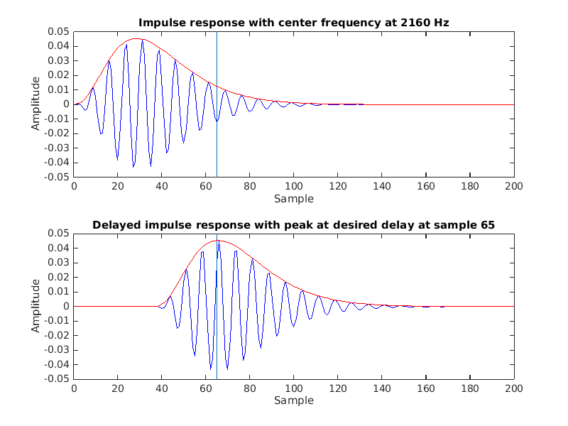 | 'fig4' | Reproduce Fig.4: Treatment of an impulse response with envelope maximum to the left of the desired group delay (at sample 65). The original complex impulse response (real part and envelope plotted in the upper panel) is multiplied with a complex factor and delayed so that the envelope maximum and the maximum of the real part coincide with the desired group delay (lower panel). |