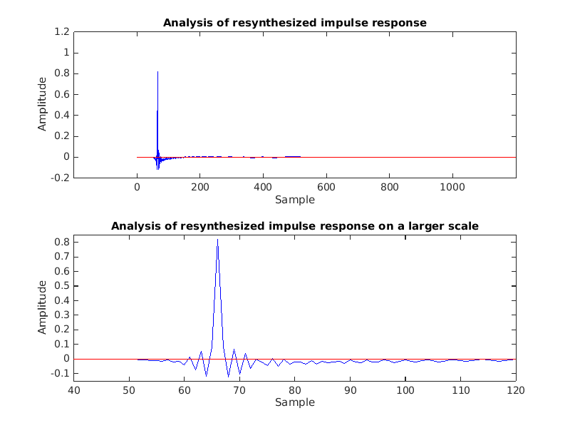 | 'fig6' | Reproduce Fig.6: Impulse response of the analysis-synthesis system using the filterbank design from section 3.1 (upper pannel). A peaked impulse is achieved at the desired group delay of 4 ms (65 samples at fs = 16276 Hz). The lower panel shows the main part of the response on a larger scale. |