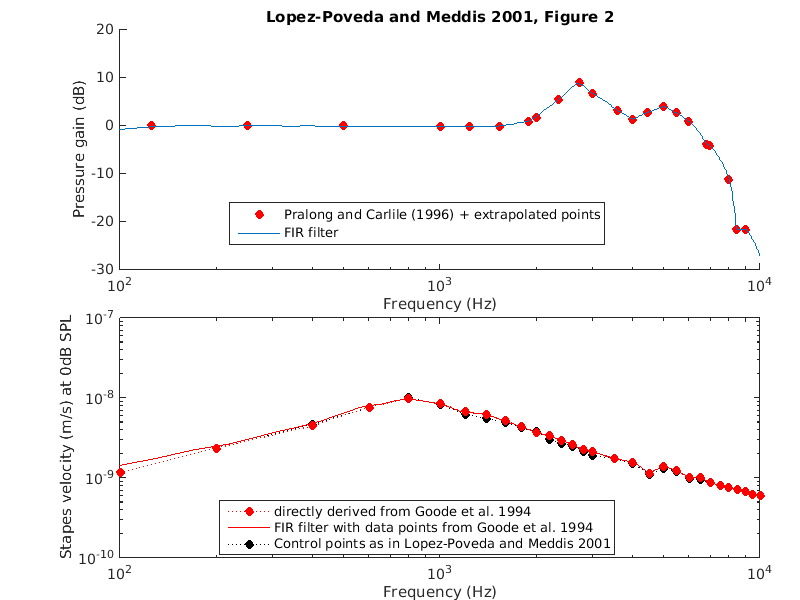 | 'fig2' | Reproduce Fig. 2 from Lopez & Poveda (2001) Fig. 2a represents the outer ear filter - pressure gain (dB) over frequency with data points from Pralong and Carlile (1996). Fig. 2b represents the middle ear filter - stapes velocity at 0dB over frequency in one plot Fig. 2b shows for default \(fs = 22050 Hz\) :
