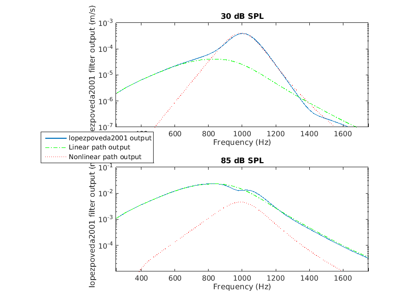 | 'fig3bc' | Reproduce Fig. 3b and c from Lopez & Poveda (2001). Isointensity response of the linear, nonlinear and summed response of the lopezpoveda2001 filter for an input level of 30dB (fig 3b) and 85dB (fig 3c) SPL The output is the output of the lopezpoveda2001 filter for the different input levels. The dimensions of the output are: input frequency x [frequency values, linear output, nonlinear output, summed lopezpoveda2001 output] x input level. |