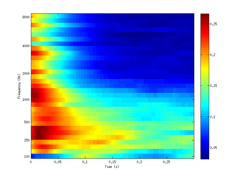 % Setup parameters fs = 44100; % Sampling rate T = 0.3; % Duration Spl1 = 75; % SPL of input signal 1 Spl2 = 75; % SPL of input signal 2 rho = 0; % normalized correlation of signals tau = 0; ild = 0; % Generate signals: t = [0:1/fs:T]; n1 = setdbspl(randn(length(t),1),Spl1); n2 = setdbspl(randn(length(t),1),Spl2); x1 = n1*sqrt((1+rho)/2) + n2*sqrt((1-rho)/2); x2 = n1*sqrt((1+rho)/2) - n2*sqrt((1-rho)/2); % Run the model and plot it [ei_map,fc] = breebaart2001_preproc([x1,x2], fs, tau, ild); plotfilterbank(ei_map,1,fc,fs,'audtick','lin');
