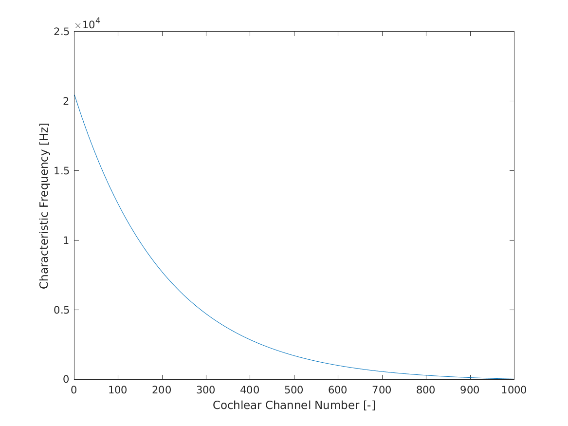 Fig. 1: Characteristic frequencies of equidistant points along the cochlea.