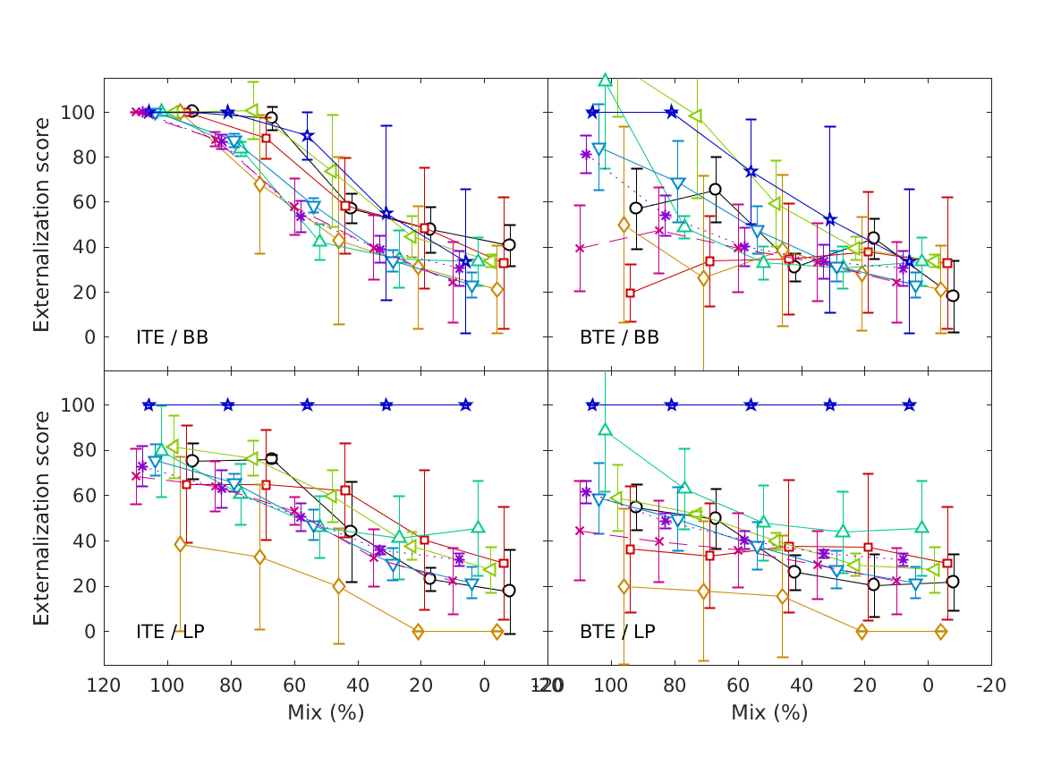 - Average externalization ratings of 1 talker for NH participants against mix point as a function of microphone position (ITE/BTE) and frequency response (BB/LP). The reference condition (ref) is the same as ITE/BB. Error bars show SEM.
