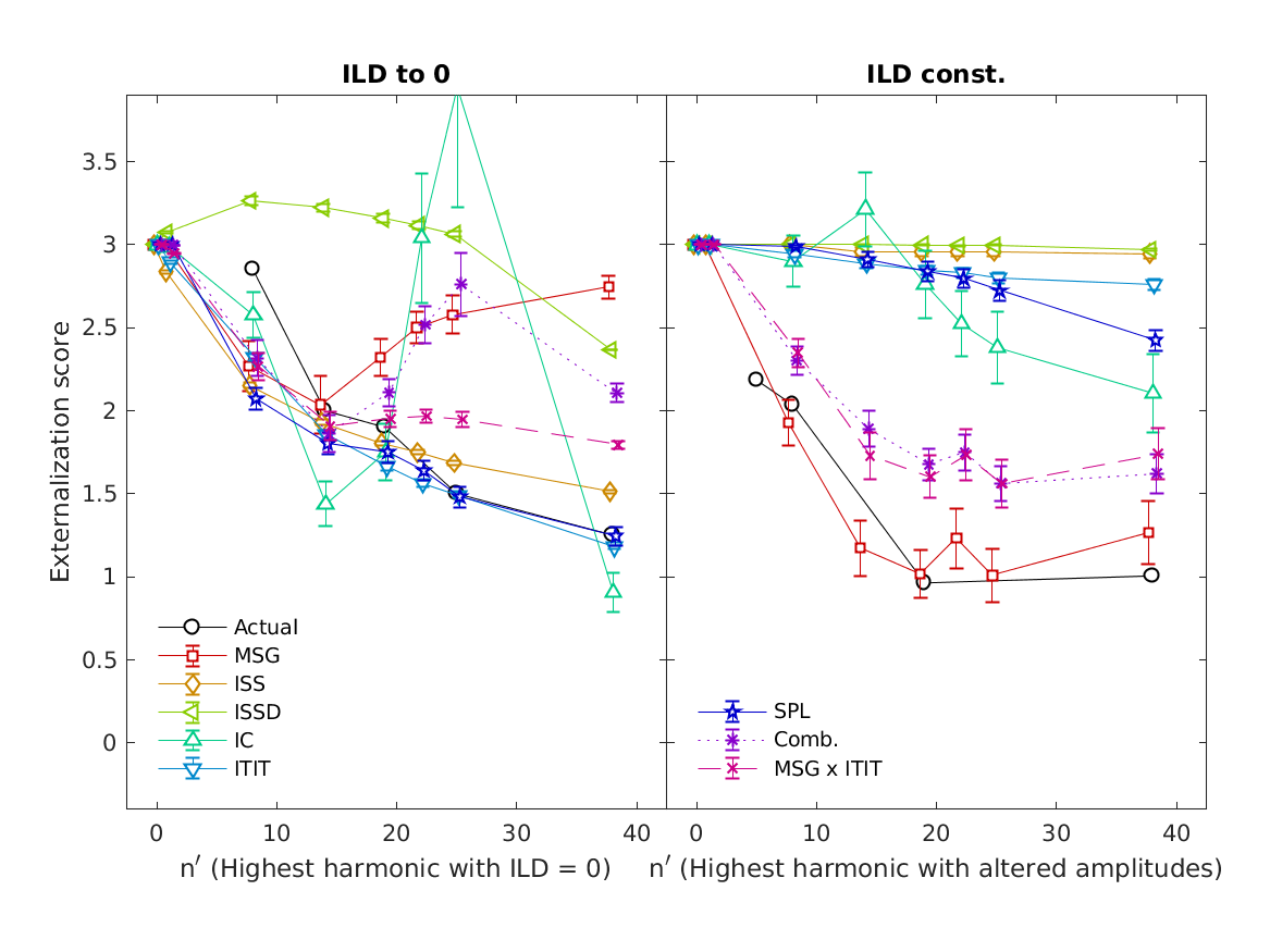 - 1st panel: Synthesis of zero-ILD signals. Only the harmonics from 1 to nprime had zero interaural level difference; harmonics above nprime retained the amplitudes of the baseline synthesis. Externalization scores as a function of the boundary harmonic number nprime. Fundamental frequency of 125 Hz. 2nd panel: Synthesis of signals to test the ISLD hypothesis. Harmonics at and below the boundary retained only the interaural spectral level differences of the baseline synthesis. Higher harmonics retained left and right baseline harmonic levels. Externalization scores as a function of the boundary frequency.