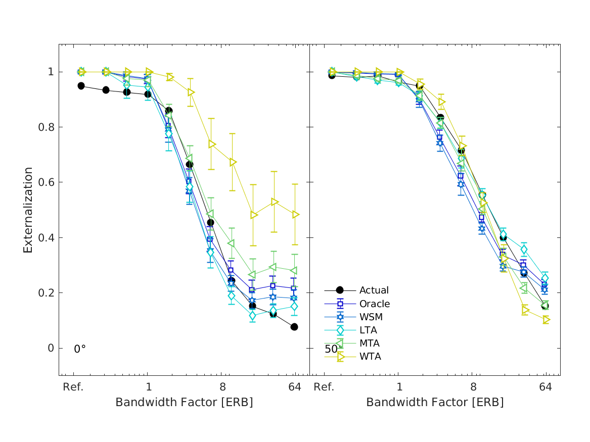 - The mean of the seven listeners perceived sound source location (black) as a function of the bandwidth factor and the corresponding model predictions (colored). The model predictions have been shifted slightly to the right for a better visual interpretation. The error bars are one standard error of the mean.