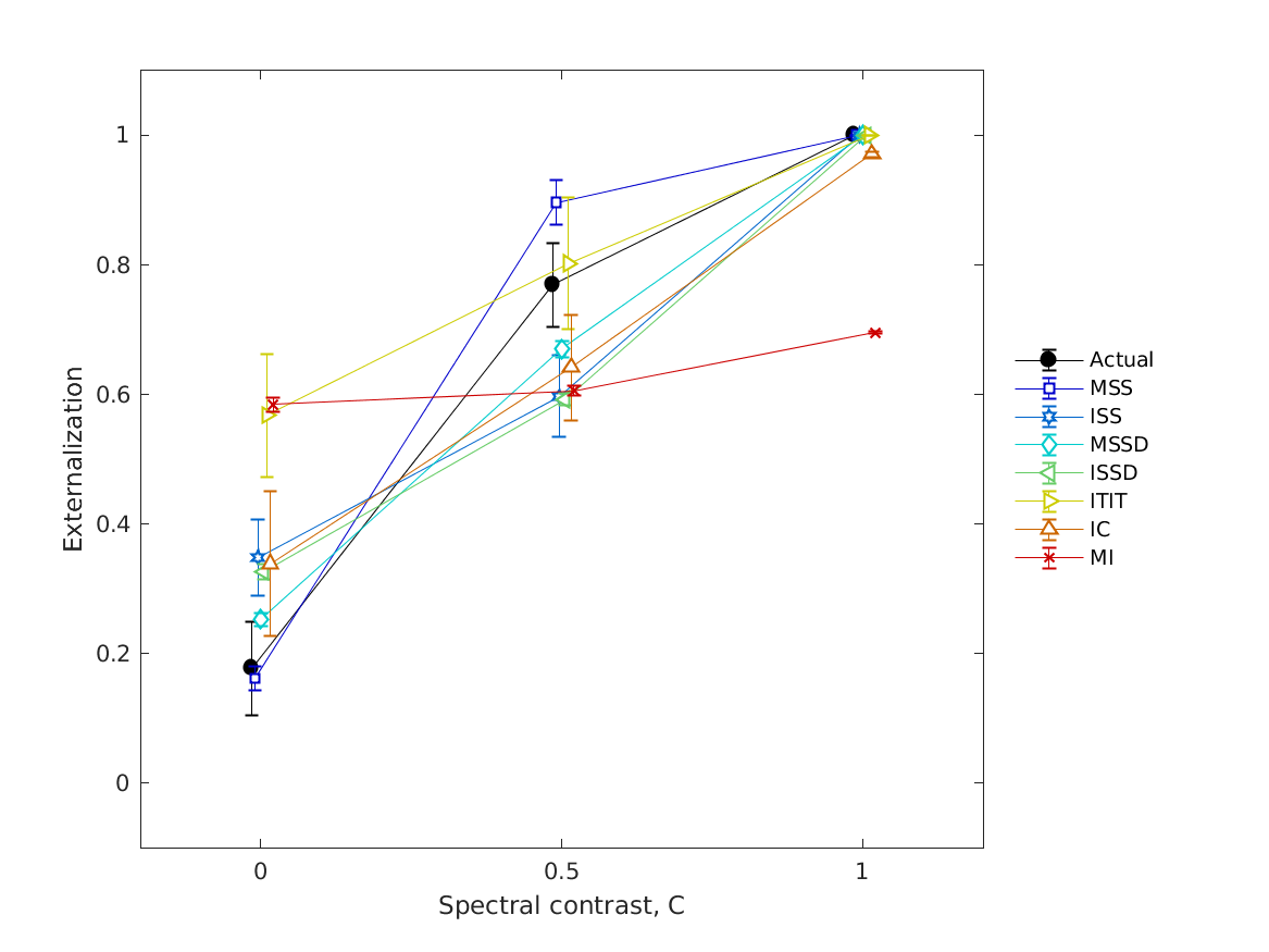 - Effect of HRTF spectral contrast manipulations on sound externalization. Externalization scores were derived from paired comparisons via Bradley-Terry-Luce modeling.
