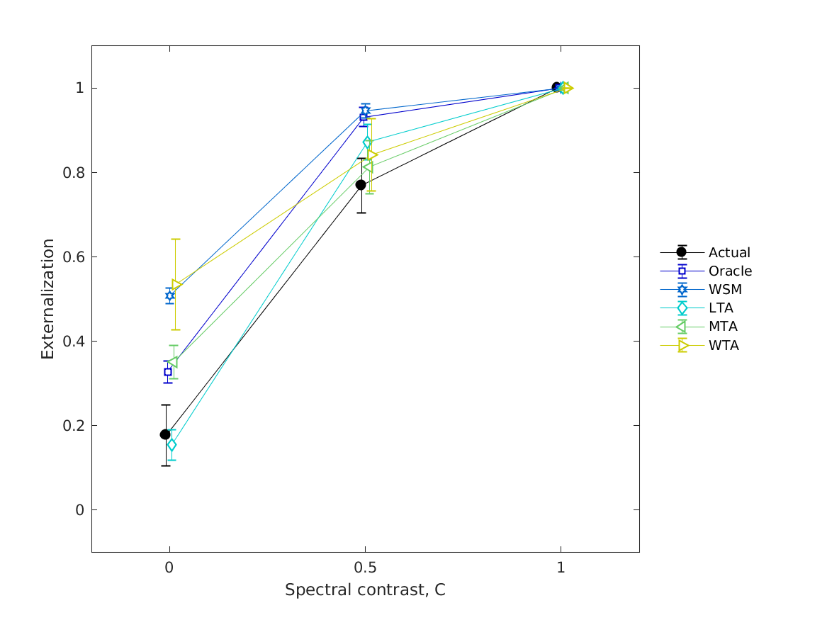 - and optimal relative weights in order to best explain the actual externalization ratings. Oracle: prediction errors obtained with the oracle model.