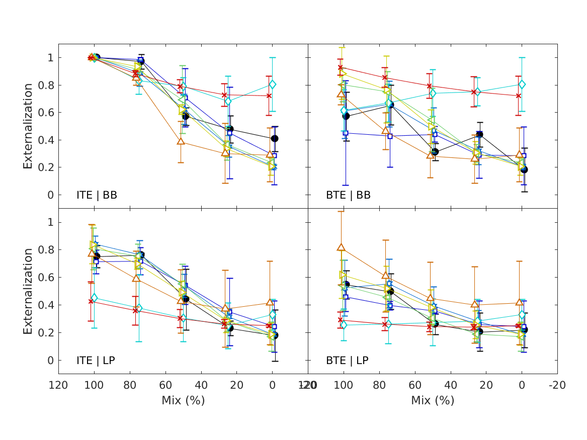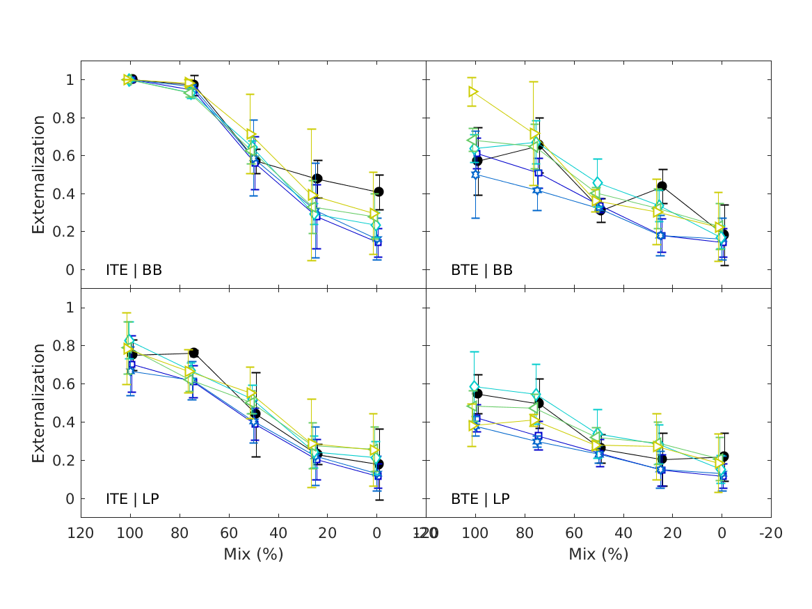 - Average externalization ratings of 1 talker for NH participants against mix point as a function of microphone position (ITE/BTE) and frequency response (BB/LP). The reference condition (ref) is the same as ITE/BB. Error bars show SEM.