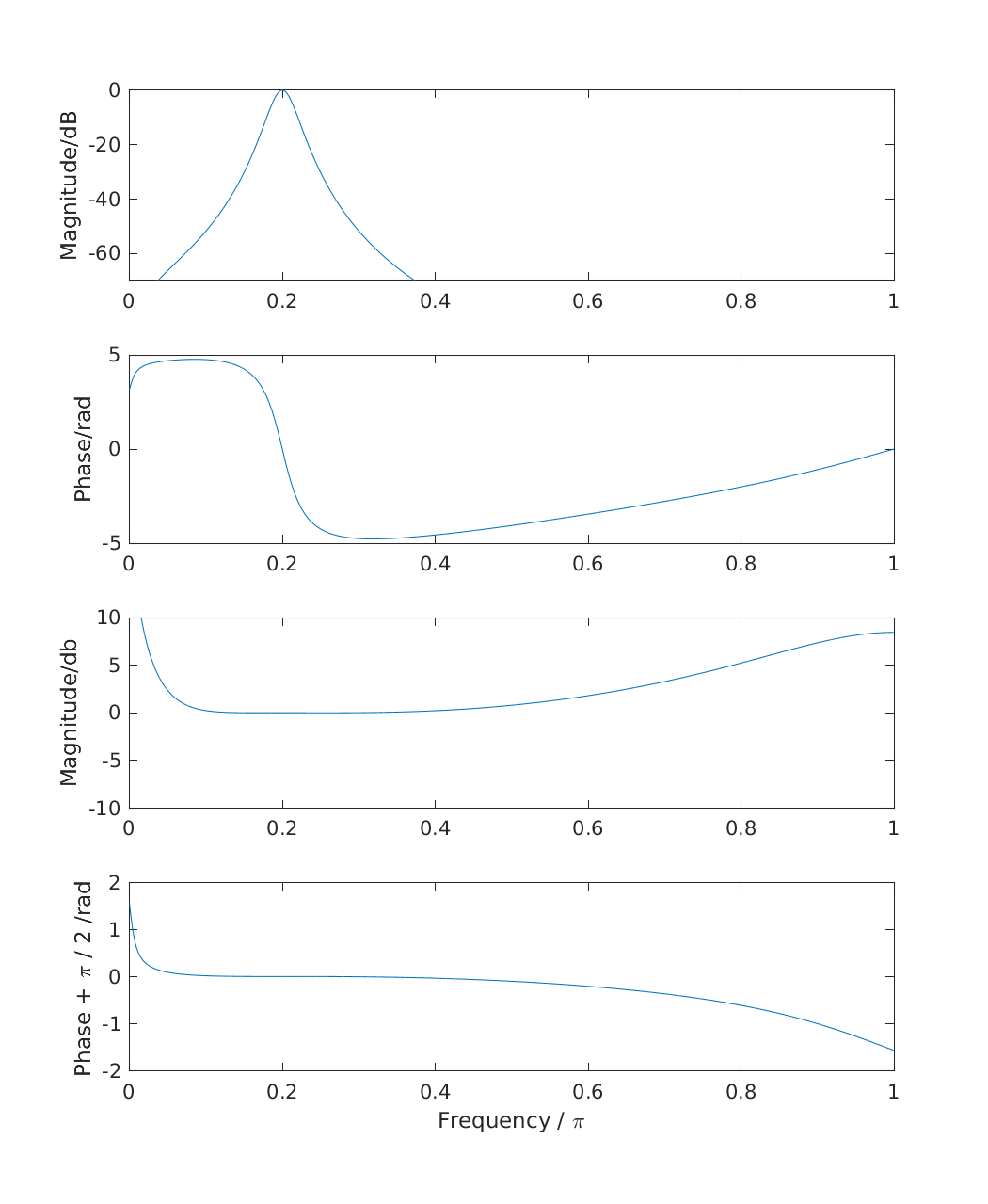 | 'fig2' | Reproduce Fig.2: Frequency response of the example Gammatone filter (upper two panels) and of the real-to-imaginary response(lower two panels). Pi/2 was added to the phase of the latter (see text). The frequency axis goes up to half the sampling rate (z=pi). |