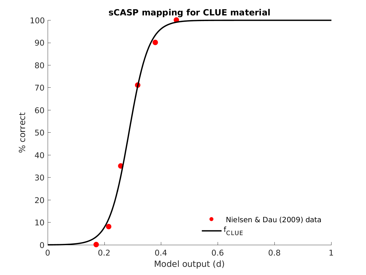 This script reproduces Figure 3 of Relano-Iborra et al. It finds the free parameters of the logistic function that relates the output of the sCASP model (correlation coefficient d) with the percentage of correct answers. The data used for this fitting is taken from Nielsen and Dau (2009). The testing conditions are replicated and fed to the sCASP model. Later a least squares analysis is used to fit the function to the data.