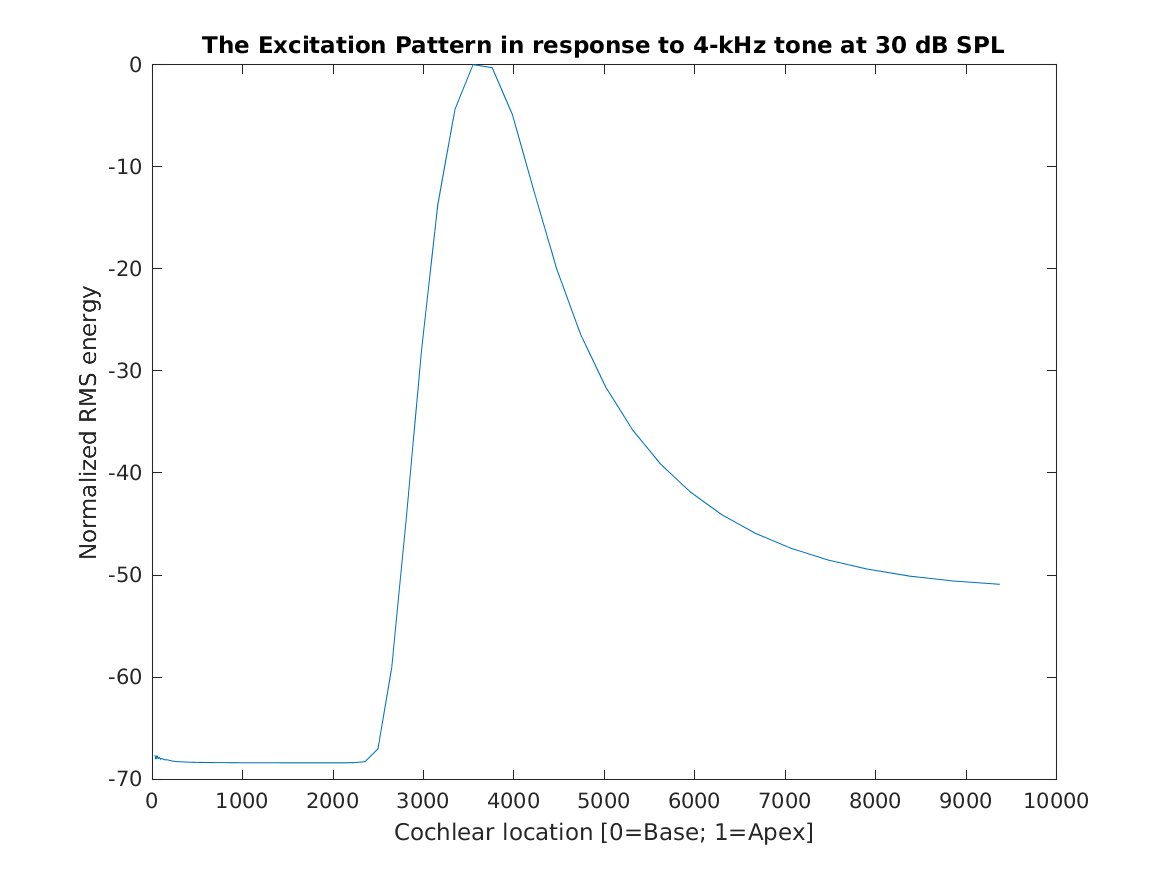 The excitation pattern in response to a 4-kHz tone at 30 dB SPL