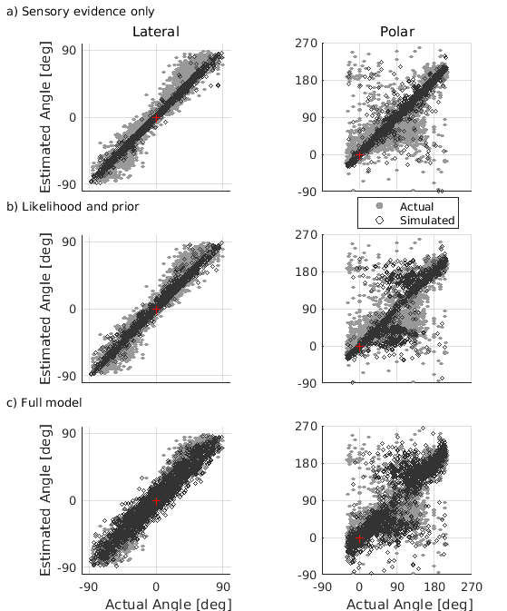 | 'fig4' | Reproduce Fig.4: Example of the fitted model based on spectral gradients. The actual data for both lateral and polar dimensions are from subject NH16 from Majdak et al. (2010). Moreover, model predictions, black dots, are: (a) based only on the likelihood function (i.e. inference driven only by sensory evidence) as in Reijniers et al. (2014) (b) Bayesian inference with both prior belief and sensory evidence. (c) Full model (i.e. Bayesian inference and sensorimotor stage. |