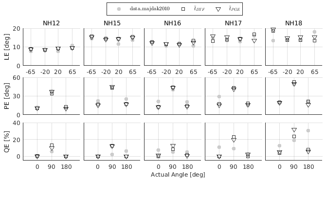 | 'fig5' | Reproduce Fig.5: Comparison between fitted models and actual data for five listeners in Majdak et al (2010). Actual (gray) and predicted (black) are the sound-localization performance metrics obtained by models based on spectral amplitues or gradients. Each row reports a different metrics: the first is about the Lateral Error (LE) as function of the lateral angle, the second and the third show the Polar Error (PE) and Quadrant Error (QE), respectively as a function of the polar angle, calculated for all targets within the lateral interval [-30, 30]deg. |