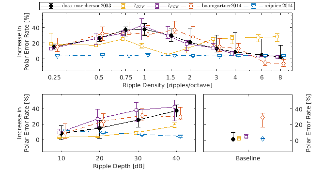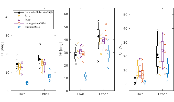 | Reproduce Fig.6: Predicted localization performance obtained for the individual (Own) and non-individual (Other) HRTFs with models based on two feature spaces. Additionally, predictions from Reijniers et al. (2014) and Baumgartner et al. (2014) as well as actual data from the original experiment Middlebrooks (1999) are shown. | |