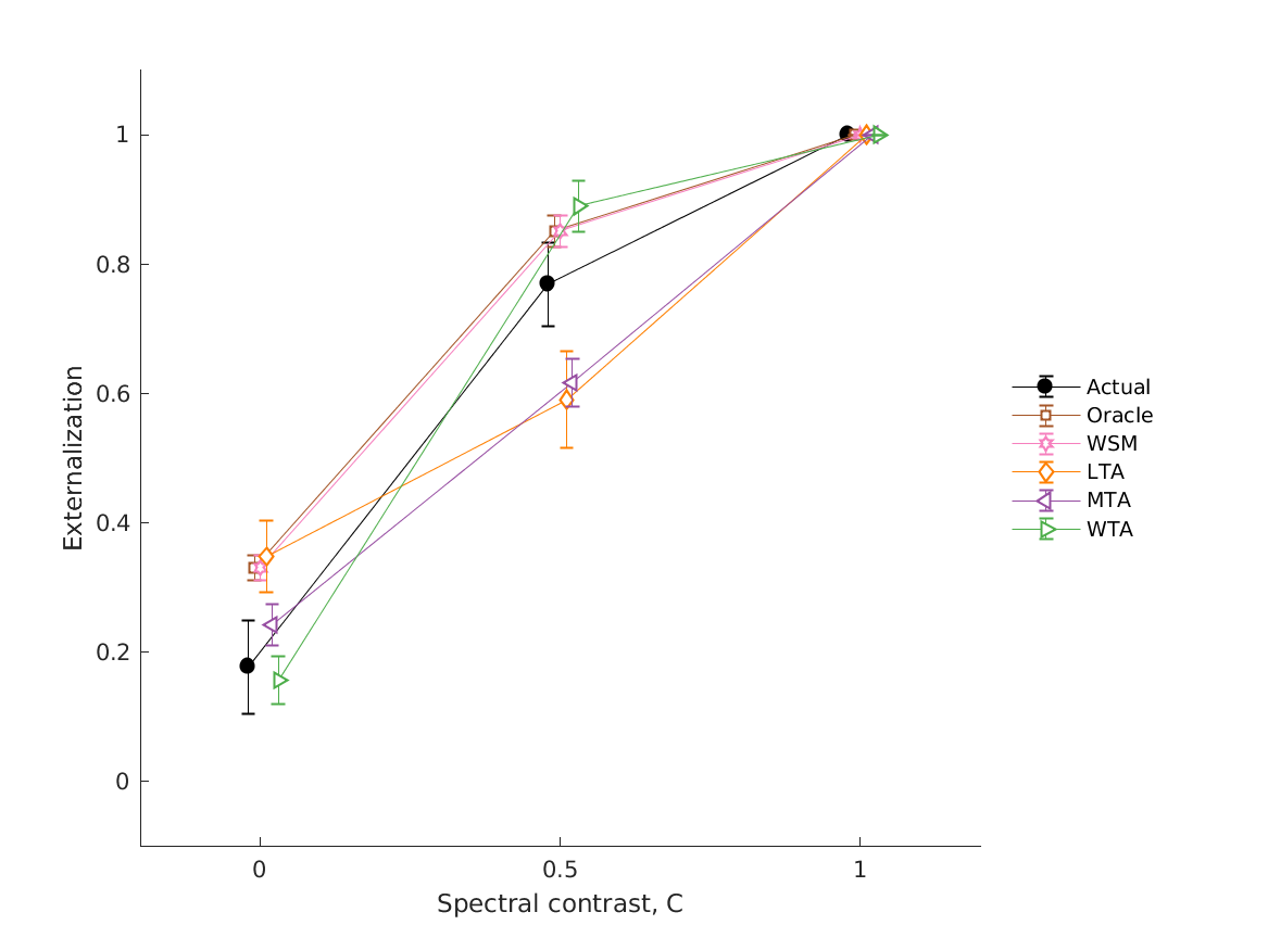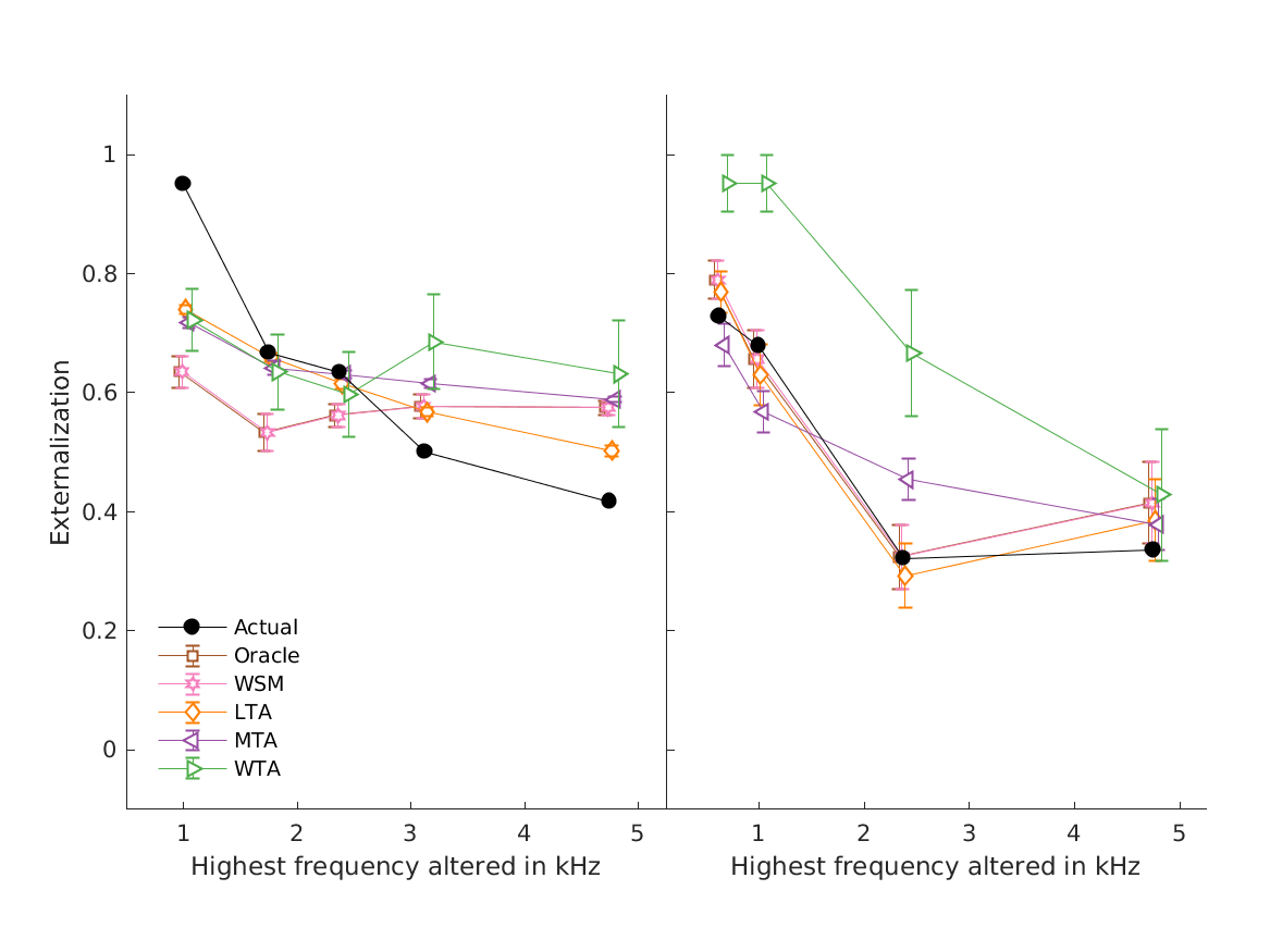- Effect of HRTF spectral contrast manipulations on sound externalization. Externalization scores were derived from paired comparisons via Bradley-Terry-Luce modeling.