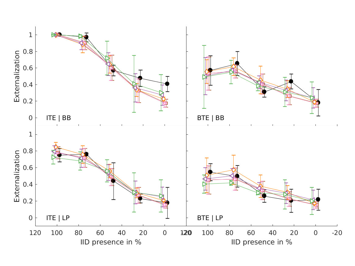 - experiments (closed circles) and simulations of the single-cue models (open symbols). Effects of low-frequency modifications tested by Hartmann and Wittenberg (1996). Exp. I: IID set to zero (bilateral average magnitude); actual data from their Fig.7, average from N=2. Exp. II: ipsilateral magnitudes flattened (IID compensated by contralateral magnitudes); actual data from their Fig.8, average from N=4. Simulated results for various cues, average from N=21. Exp.III: effect of spectral smoothing of low-frequency sounds presented from various azimuths (left: 0; right: 50); actual data represents direct-sound condition from Hassager et al. (2016), average from N=7. Simulated N=21. Exp.IV: effect of spectral smoothing in high frequencies as a function of spectral contrast (C=1: natural listener-specific spectral profile; C=0: flat spectra); actual data calculated from the paired-comparison data from Baumgartner et al. (2017), N=10 (actual and simulated). Exp.V: effects of stimulus bandwidth and microphone casing for various mixes between simulations based on listener-specific BRIRs (100%) and time-delay stereophony (0%); actual data from Boyd et al. (2012), N=3 (actual and simulated). ITE: in-the-ear casing; BTE: behind-the-ear casing; BB: broadband stimulus; LP: low-pass filtered at 6.5kHz; Error bars denote standard errors of the mean.