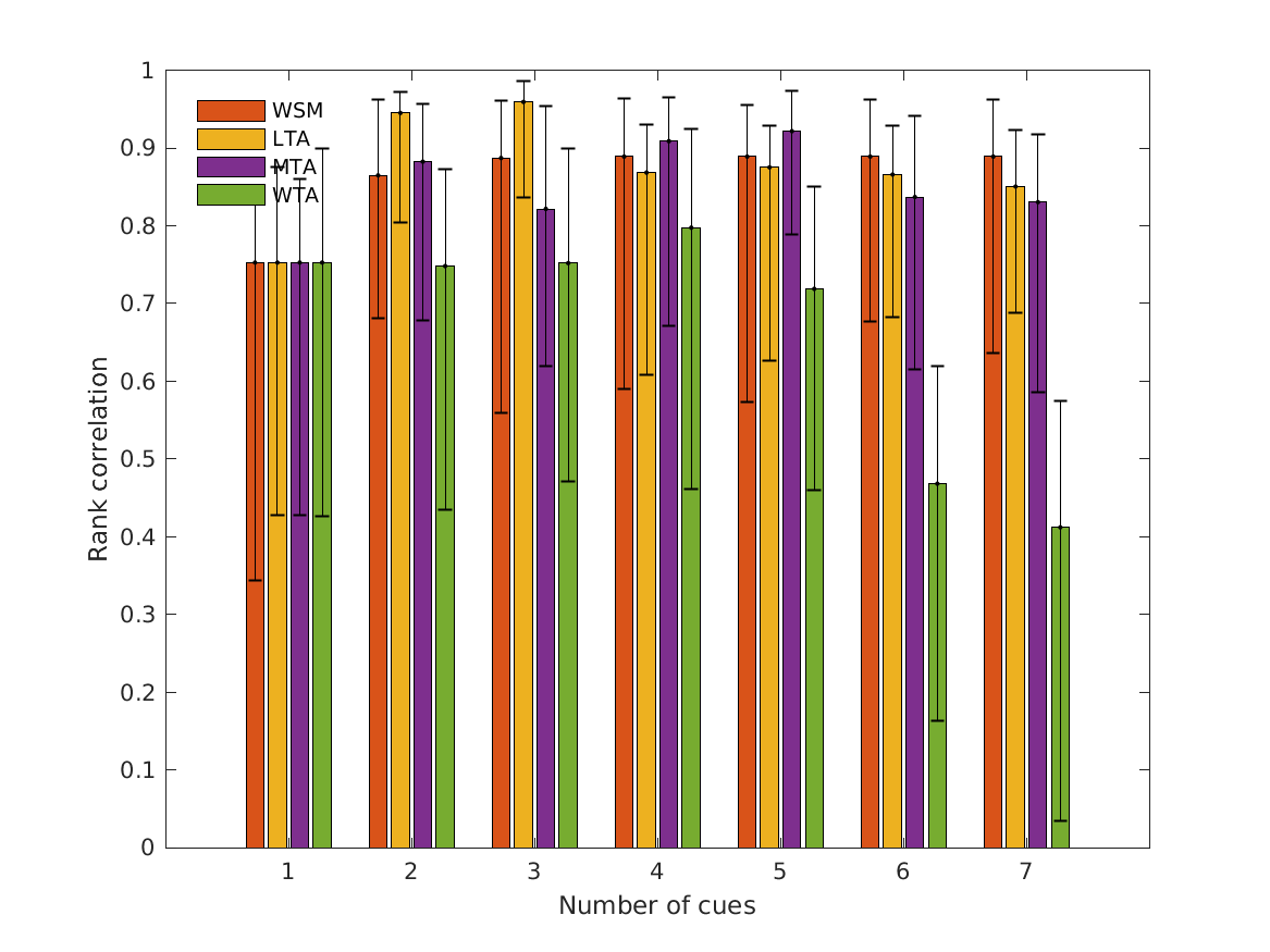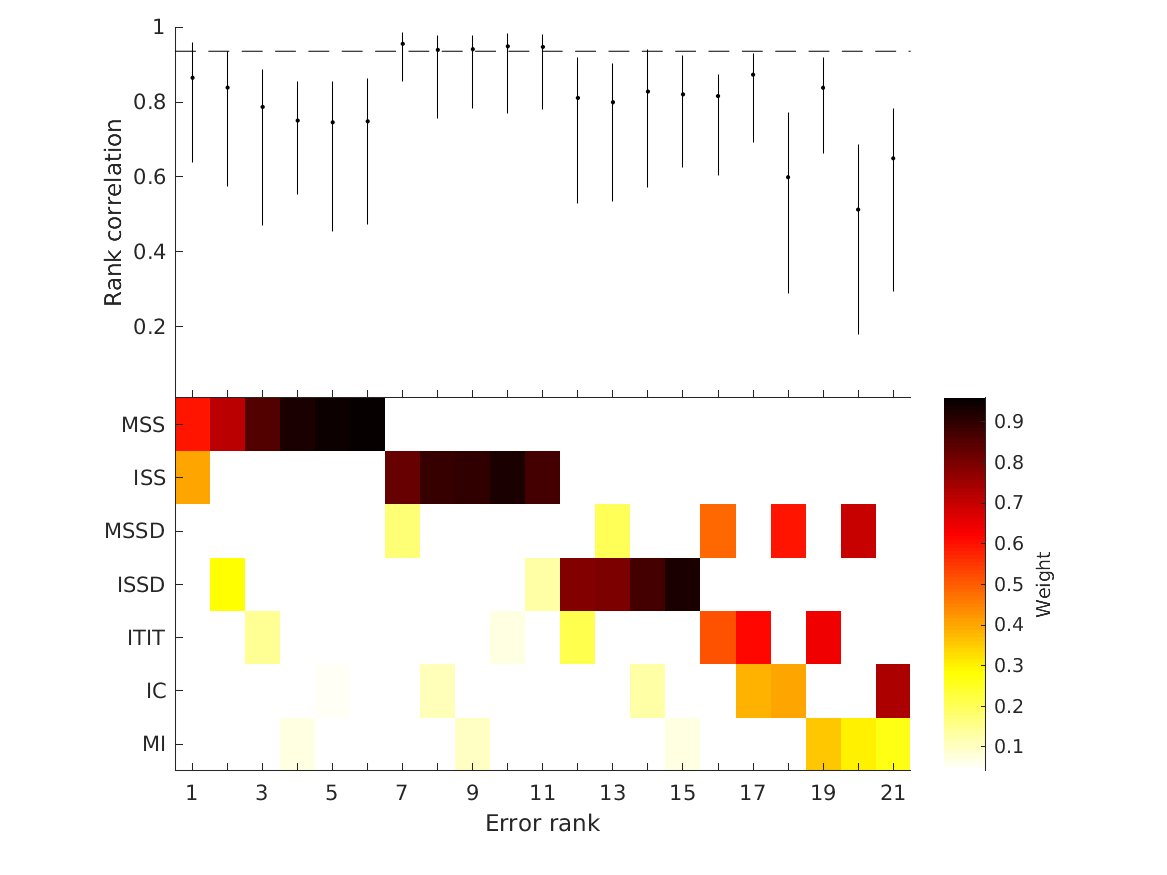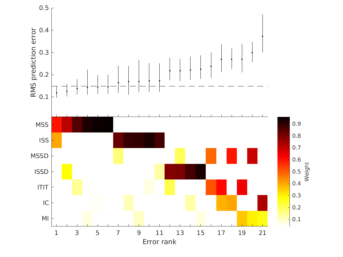 - combinations show that static combination (WSM) based on monaural and interaural spectral shape cues (MSS, ISS) performs best. RMS simulation errors for different strategies and pooled experimental data, N=54. Error bars denote 95% confidence intervals estimated via bootstrapping (1000 resamples). WSM: weighted-sum model; L/M/WTA: looser/median/winner takes all. Individual cue contributions. Cue abbreviations defined in Tab.1. Top: Simulation errors for pairwise combinations of considered cues. Dashed line shows the border of significant difference to the best pair (MSS and ISS). Bottom: Considered cue pairs with their respective weights (encoded by brightness).