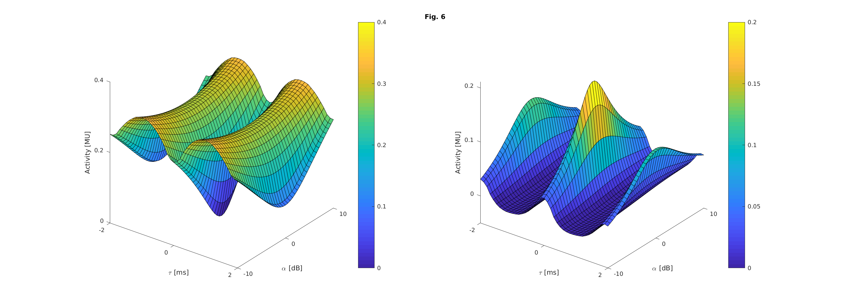 | 'a_fig6' | Reproduce Fig. 6 from Breebaart et al. (2001a): Left panel: Idealized EI-activity for a wideband diotic noise (0-4000 Hz) with an overall level of 70 dB SPL (offset = default = 100 dB) for an auditory filter which is nearest to the frequency of the tone. Right panel: change in the activity pattern of the left pannel if a 500-Hz interaurally ou-of-phase signal (Spi) is added with a level of 50 dB (offset = default = 100 dB). Both signal and master have a duration of 1 second and the figures show the mean output of the first 100 ms. |