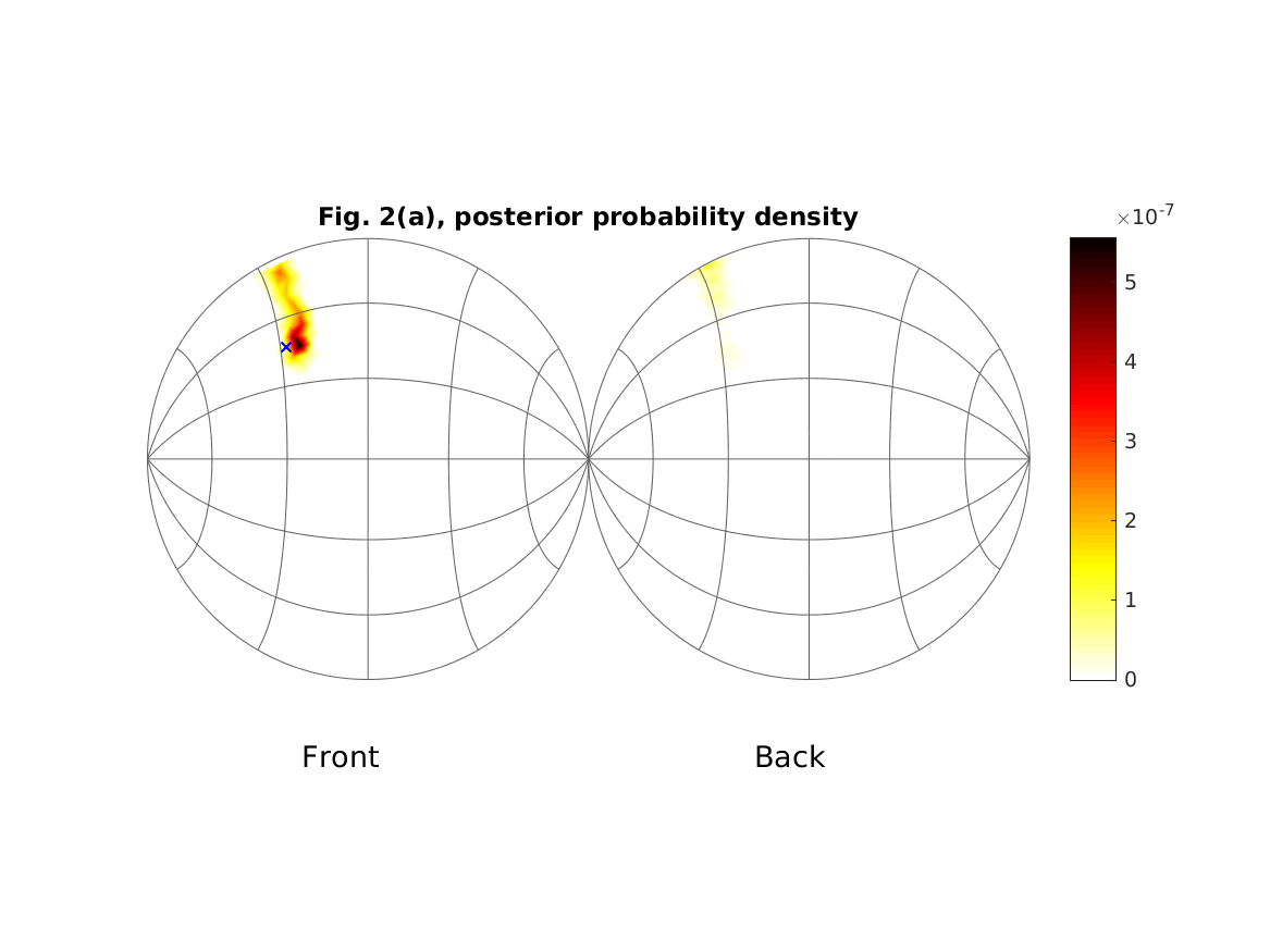 | 'fig2a' | Reproduce Fig. 2 (a): The results for simulated trial of a locali- zation experiment for subject 1 [see also Fig. 3(a)] in front Theta = (-34,45)deg (a) is shown. The figures show the simulated posterior angular probabilities and the templates corresponding to the original direction Theta (solid black line) and estimated direction Theta_est (dotted black line). The simulated auditory input is shown as the solid red line. |