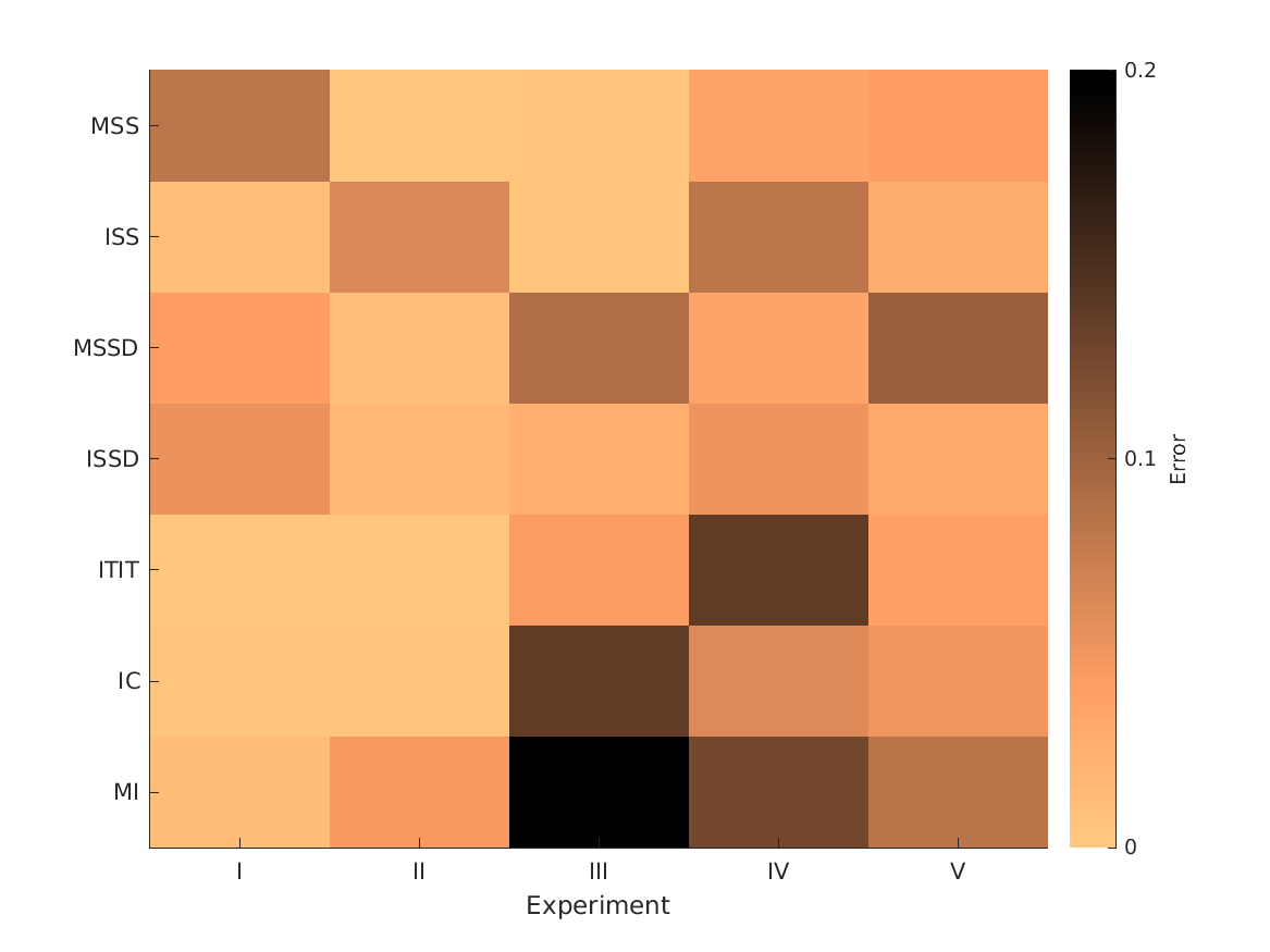| 'fig4' | Simulation errors for different decision strategies and cue combinations show that static combination (WSM) based on monaural and interaural spectral shape cues (MSS, ISS) performs best. RMS simulation errors for different strategies and pooled experimental data, N=54. Error bars denote 95% confidence intervals estimated via bootstrapping (1000 resamples). WSM: weighted-sum model; L/M/WTA: looser/median/winner takes all. Individual cue contributions. Cue abbreviations defined in Tab.1. Top: Simulation errors for pairwise combinations of considered cues. Dashed line shows the border of significant difference to the best pair (MSS and ISS). Bottom: Considered cue pairs with their respective weights (encoded by brightness). Add flag supplements to also show the results for evaluations based on rank correlations. |
