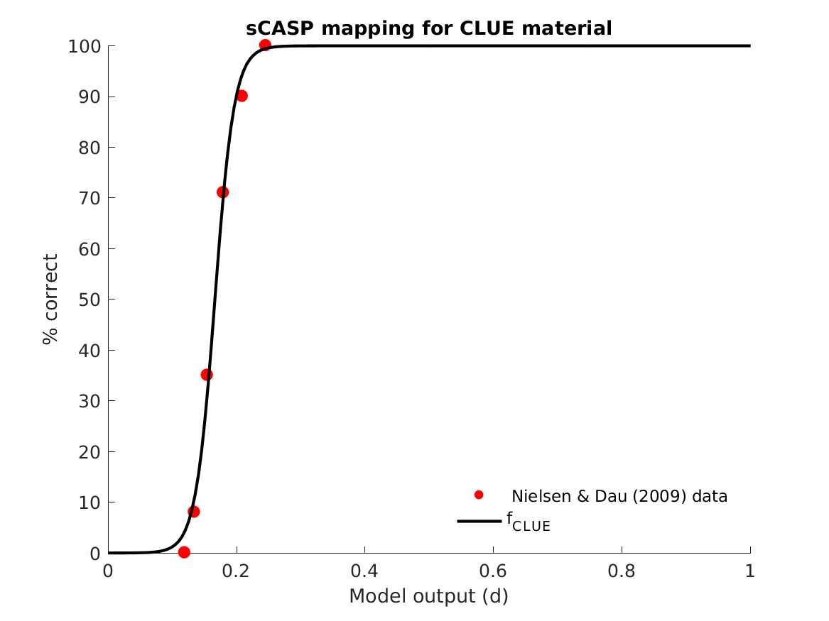 This script reproduces Figure 3 of Relano-Iborra et al. It finds the free parameters of the logistic function that relates the output of the sCASP model (correlation coefficient d) with the percentage of correct answers. The data used for this fitting is taken from Nielsen and Dau (2009). The testing conditions are replicated and fed to the sCASP model. Later a least squares analysis is used to fit the function to the data.