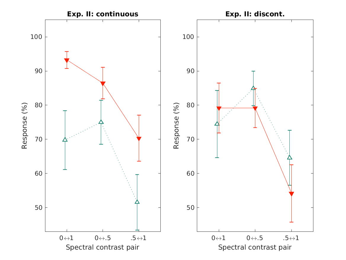 | 'fig2' | Behavioral responses were more consistent for sounds perceived as approaching compared to sounds perceived as receding if instantaneous spectral changes were presented in continuous stimuli. Mean behavioral responses in the 3?AFC motion discrimination task of Exp. I (fist figure; N = 15) and the 2?AFC motion discrimination task of Exp. II (second figure; N = 13). Results of Exp. II are separated between trials presenting instantaneous but continuous (Left; as in Exp. I) and discontinuous (Right) spectral contrast switches. Decreasing spectral contrast switches (orange lines) were predominantly perceived as approaching (orange triangles), increasing spectral contrast switches (green lines) as receding (green triangles), and constant spectral contrasts (no lines) as static (gray squares). Statistical analyses focused on these predominant response associations. Values reflect mean ??1 SEM. |