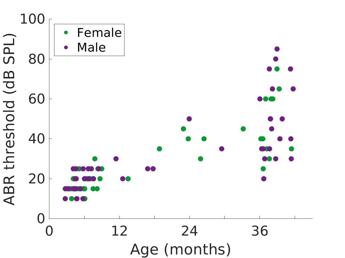 | 'fig3' | Reproduce Fig. 3: Plot the animal's hearing sensitivity as derived from the ABR to chirps as a function of the animal's age in months. Males and females are plotted separately. |