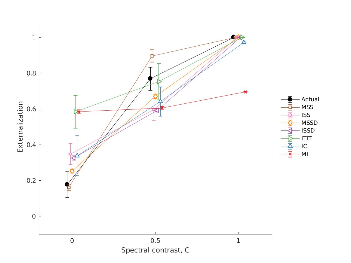 | 'fig2' | Externalization ratings: actual data from psychoacoustic experiments (closed circles) and simulations of the single-cue models (open symbols):