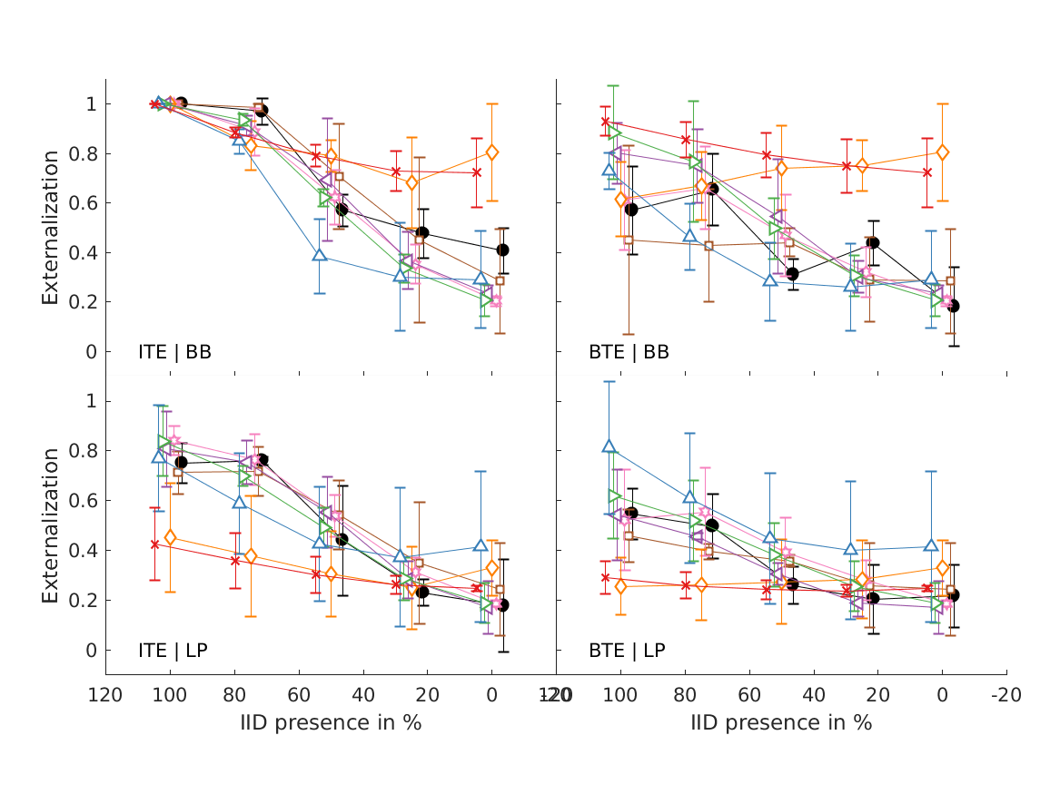 | 'boyd2012' | Models experiments from Boyd et al. (2012; Fig.1, top). Average externalization ratings of 1 talker for NH participants against mix point as a function of microphone position (ITE/BTE) and frequency response (BB/LP). The reference condition (ref) is the same as ITE/BB. Error bars show SEM. |