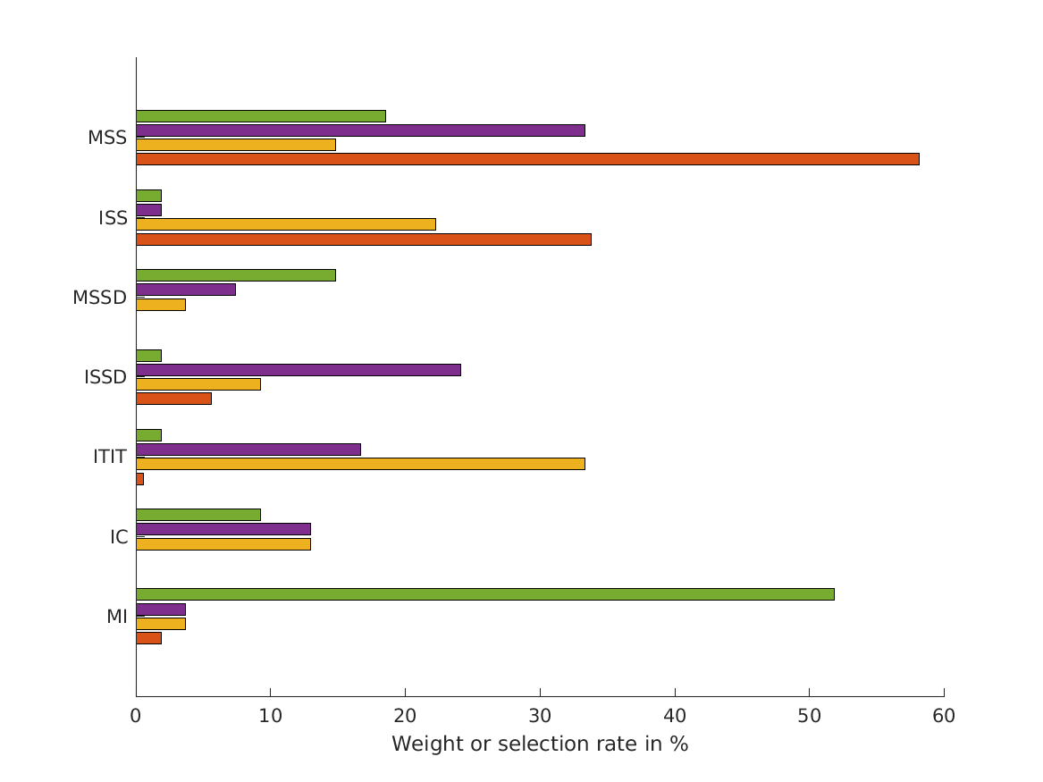 | 'fig4' | Simulation errors for different decision strategies and cue combinations show that static combination (WSM) based on monaural and interaural spectral shape cues (MSS, ISS) performs best. RMS simulation errors for different strategies and pooled experimental data, N=54. Error bars denote 95% confidence intervals estimated via bootstrapping (1000 resamples). WSM: weighted-sum model; L/M/WTA: looser/median/winner takes all. Individual cue contributions. Cue abbreviations defined in Tab.1. Top: Simulation errors for pairwise combinations of considered cues. Dashed line shows the border of significant difference to the best pair (MSS and ISS). Bottom: Considered cue pairs with their respective weights (encoded by brightness). Add flag supplements to also show the results for evaluations based on rank correlations. |