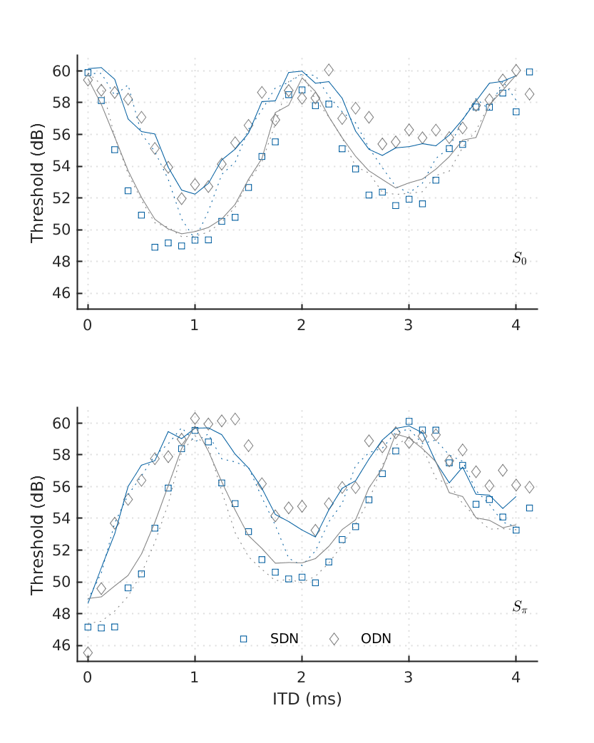 | 'fig3' | Reproduces Figure 3 from Eurich et al. (2022). Experimental data from van der Heijden and Trahiotis (1999) (symbols). The continuous lines show the predictions of the presented model including the across-channel incoherence interference. The dashed lines show predictions for ODN excluding interference (single- channel version), equivalent to Encke and Dietz (2022). Upper panel: Detection thresholds with \(S_0\) targets. Lower panel: \(S_\pi\) targets. |