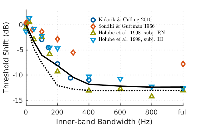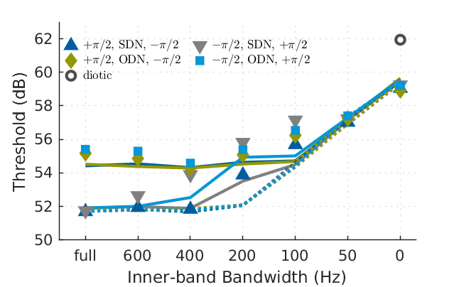 | 'fig5' | Reproduces Figure 5. Symbols denote data from binaural detection experiments with the configuration \(N_{\pi 0\pi} S\pi\) as a function of the inner-band (\(N_0\)) bandwidth; continuous and dotted line: model prediction with and without across-incoherence incoherence interference, respectively. |