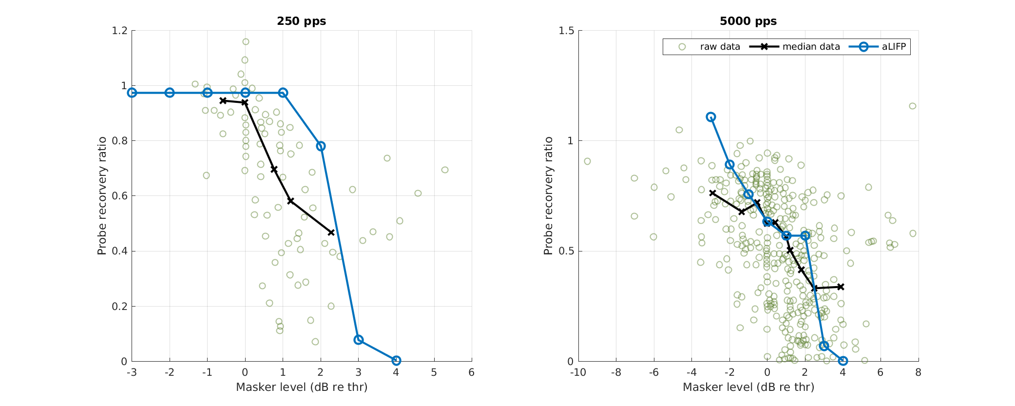 | 'fig8' | Facilitation and accommodation as calculated from spike trains by Heffer et al. (2010). Negative values indicate accommodation, while positive ones denote facilitation. The predictions from the aLIFP model fit the data nicely, except for 2000 pps at low levels, where the aLIFP model overestimates the facilitation. |