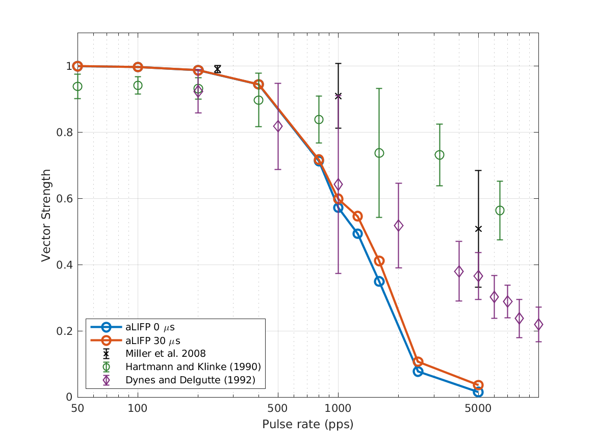 | 'fig11' | The vector strength from Miller et al. (2008), Hartmann and Klinke (1990) and Dynes and Delgutte (1992) for different pulse rates measured in cats. As the were made both for duration of the IPG was not clear, the predictions an IPG of 0 \(\mu s\) and 30 \(\mu s\). The predictions of the aLIFP model are not affected by the IPG and it fits the data for both pulse shapes up to 1600 pps. |