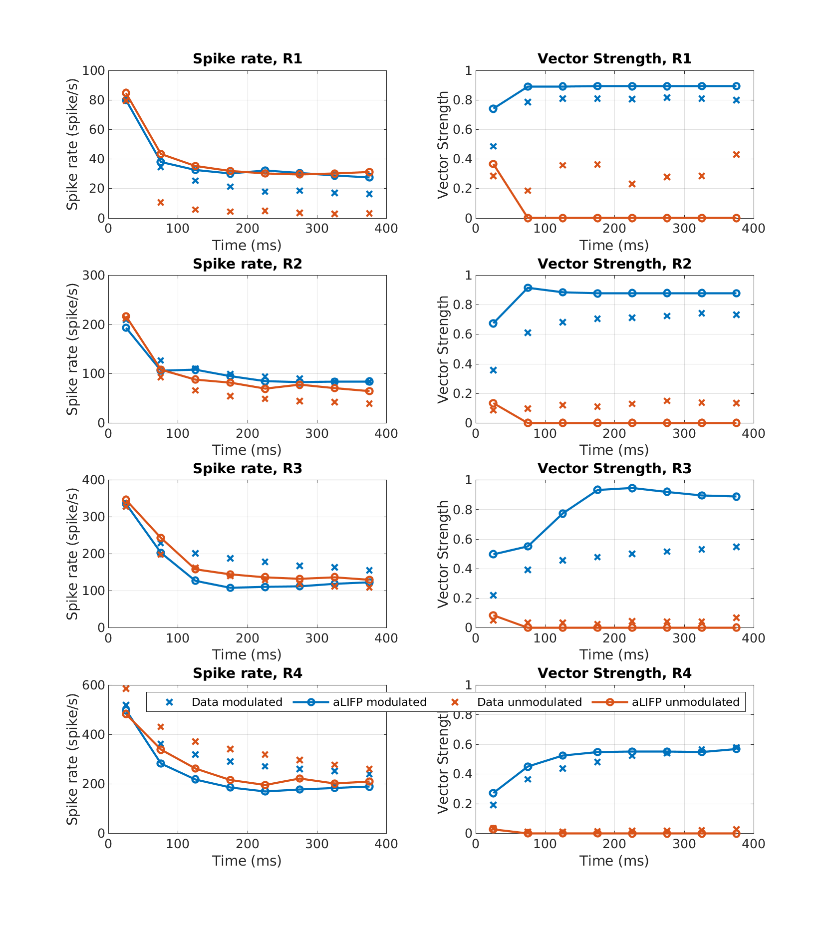 | 'fig12' | The spike rate and the vector strength of 100 Hz sinusoidally amplitude modulated and unmodulated pulse trains with a rate of 5000 pps were calculated. The predictions the aLIFP model were compared to data of 72 cat nerve fibers from Hu et al. (2010). |