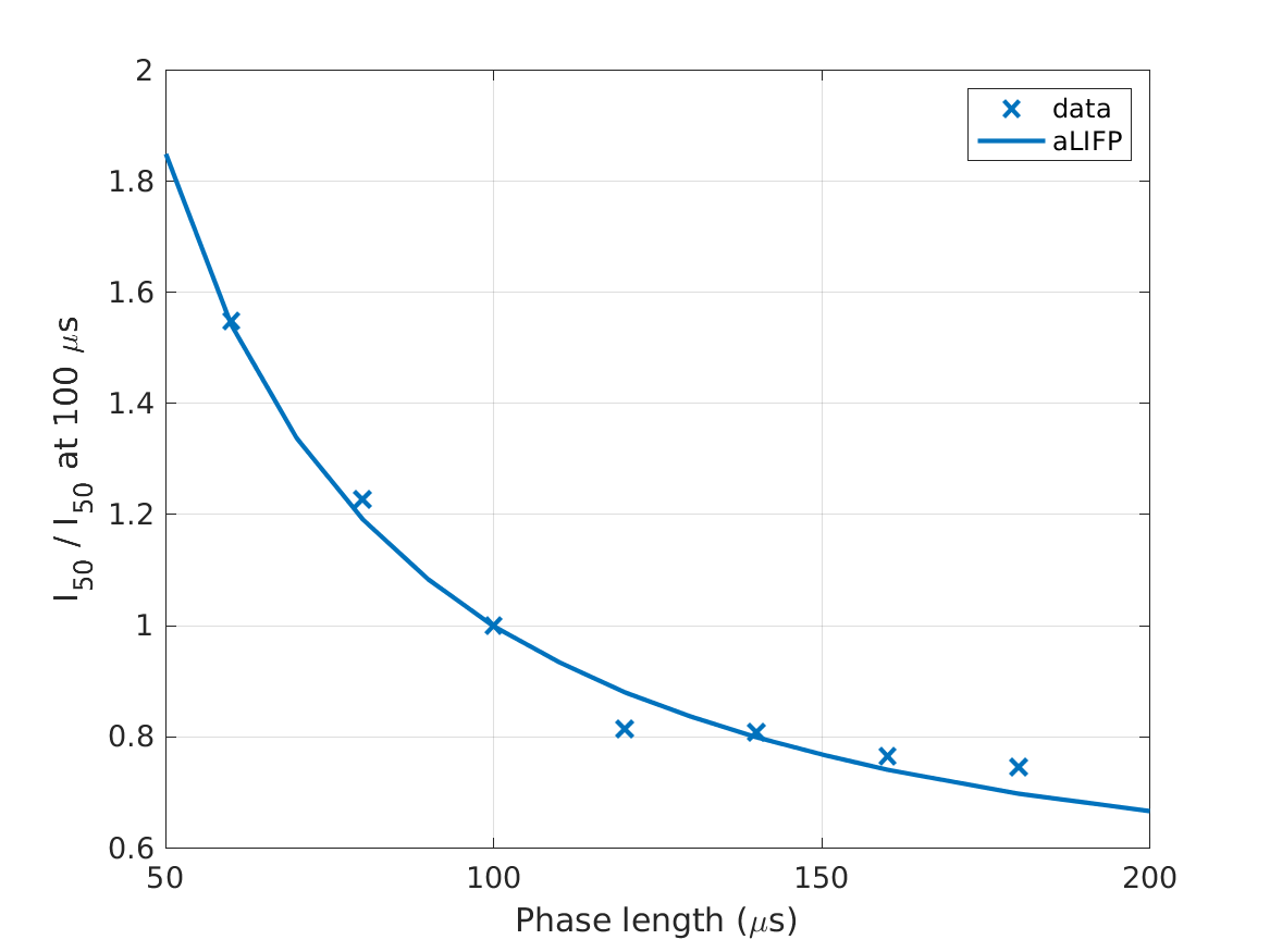 | 'fig5a' | The \(I_{50}\) (current amplitude at 50% firing probability) for biphasic pulses with different phase durations is shown, normalized on the \(I_{60}\) of the pulse with a 100-\(\mu s\) phase duration. The figure shows both the predictions by the aLIFP model and the data recorded by Shepherd and Javel (1999) from a single cat auditory nerve fiber. |